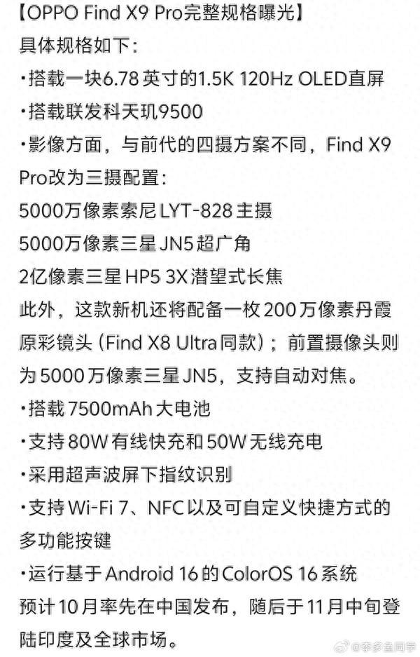 【TechWeb】去年10月,OPPO推出了OPPO Find X8 Pro,这是全球首款配备双潜望长焦的天玑旗舰,一经亮相便受到了众多用户的好评。而在不久前,关于新一代的OPPO Find X9系列的爆料也开始进入大家的视野,尤其将有望首发搭载全新的天玑9500旗舰芯片,备受大家关注。现在有最新消息,近日有数码博主进一步带来了OPPO Find X9 Pro的详细参数细节。