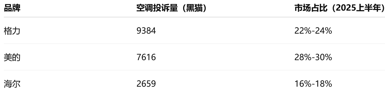与此同时,另一投诉平台黑猫投诉却显示:格力空调的投诉量远高于美的(000333)与海尔(600690),令这场公信力之争更添复杂意味。