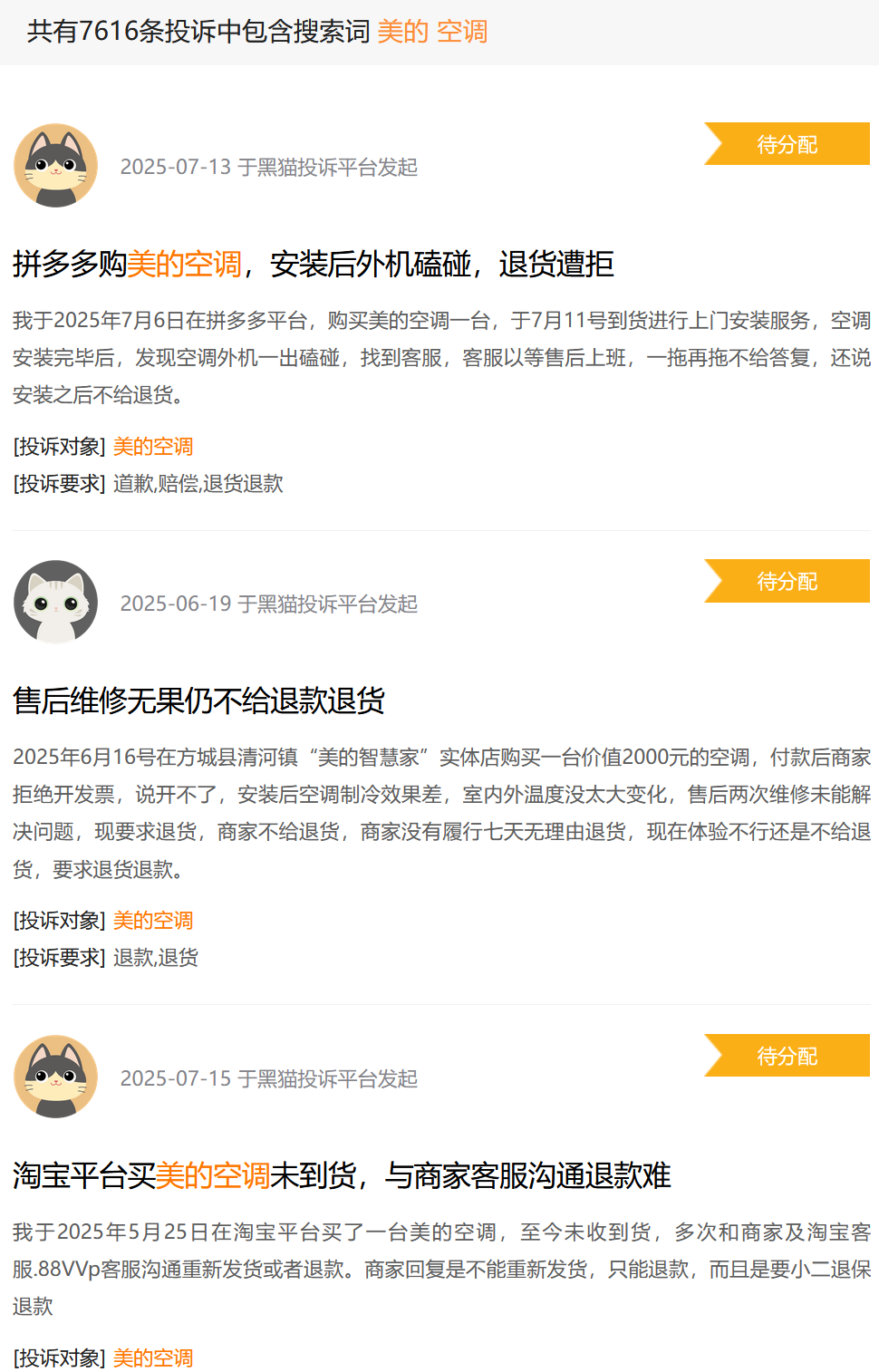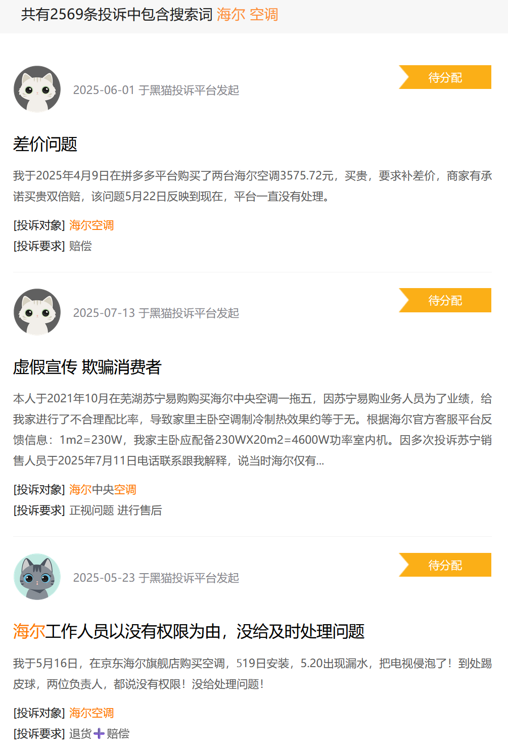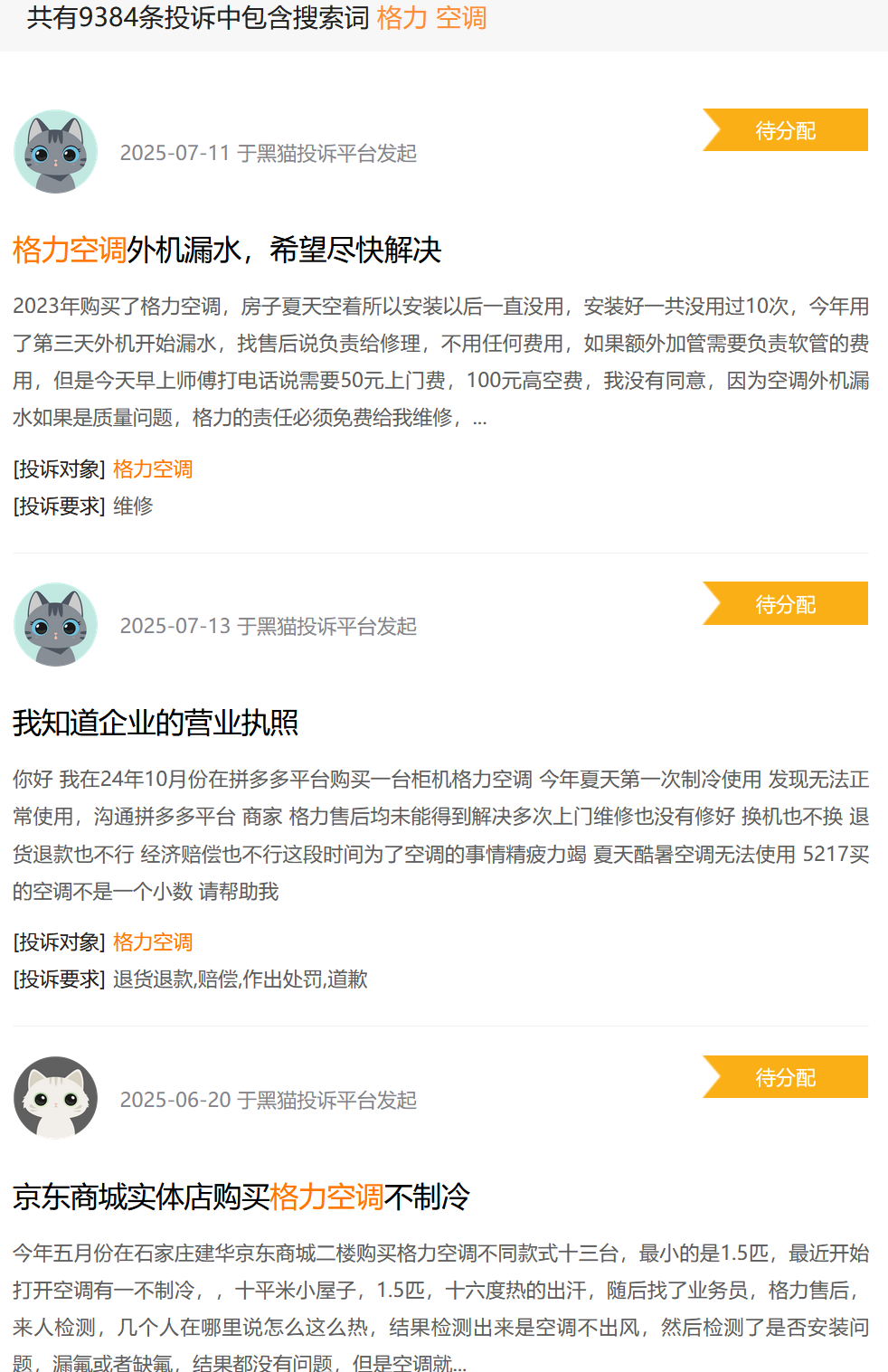 截至2025年7月21日,在“黑猫投诉”平台上,搜索关键词“格力+空调”的结果为9384条,显著高于“美的+空调”的7616条与“海尔+空调”的2659条。这一数据与格力在空调市场的市占率并不匹配。同样,“仅为搜索结果,不代表相关企业的投诉总量”,但同一时期横向比较,这一数据还是能够说明一定的问题。